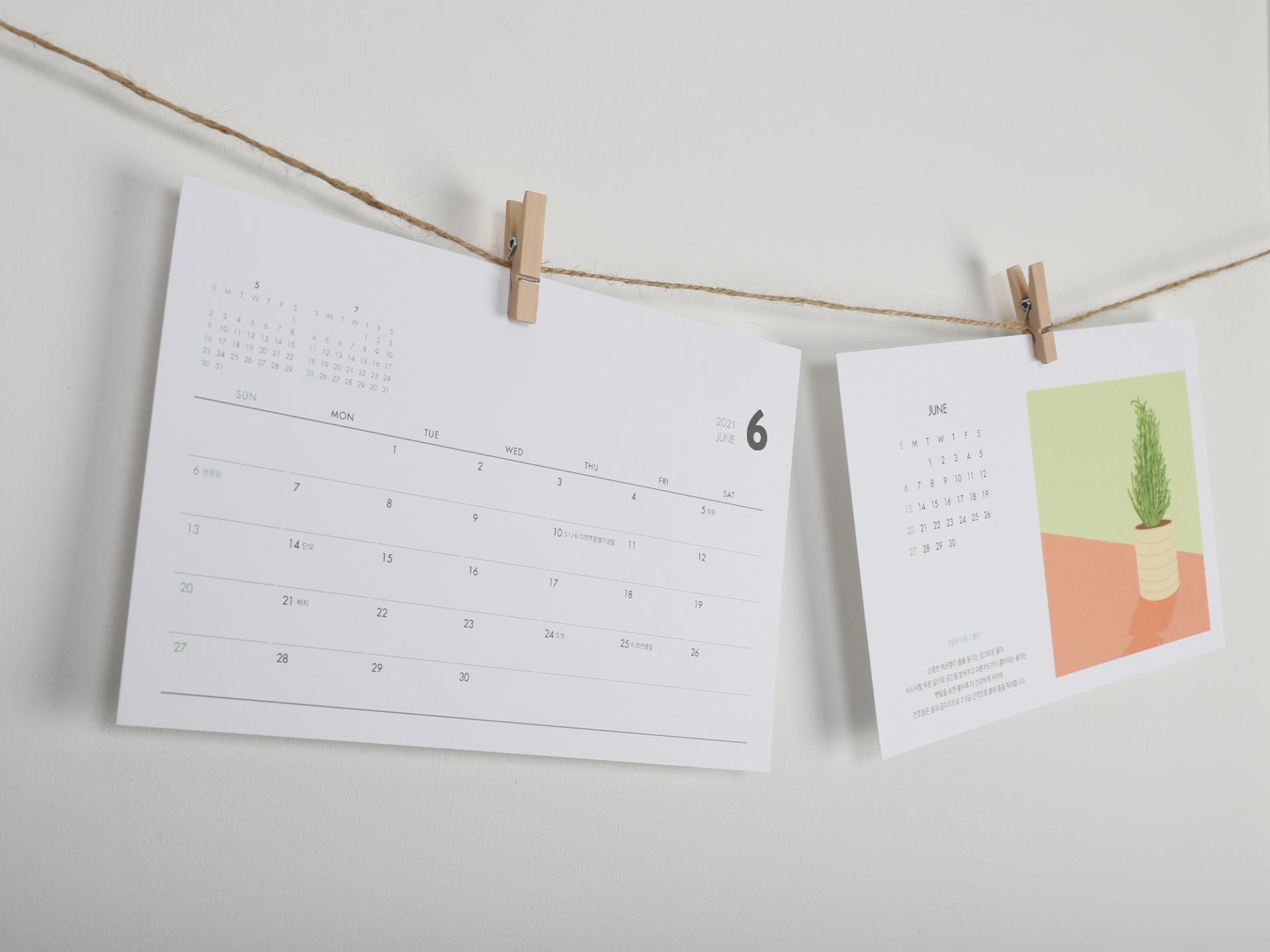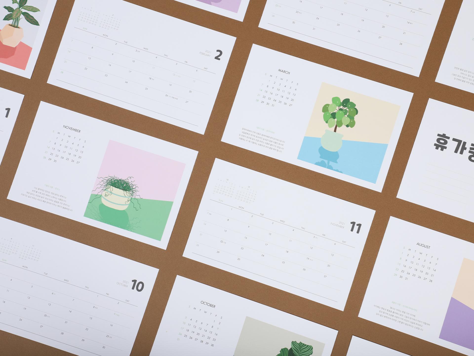 가까이 두고 기르는 '반려식물'을 주제로 직접 디지털 드로잉한 이미지를 삽입하여 책상 위 플랜테리어 감성을 더한 캘린더입니다. 매월 달라지는 추천 반려식물과 꽃말+설명+키우는 팁을 삽입하여 달력을 보는 재미를 더하였고, 전면 기본 월판뿐만 아니라 후면 그림판에도 월력을 가독성있게 배치하여 실용성을 높였습니다.