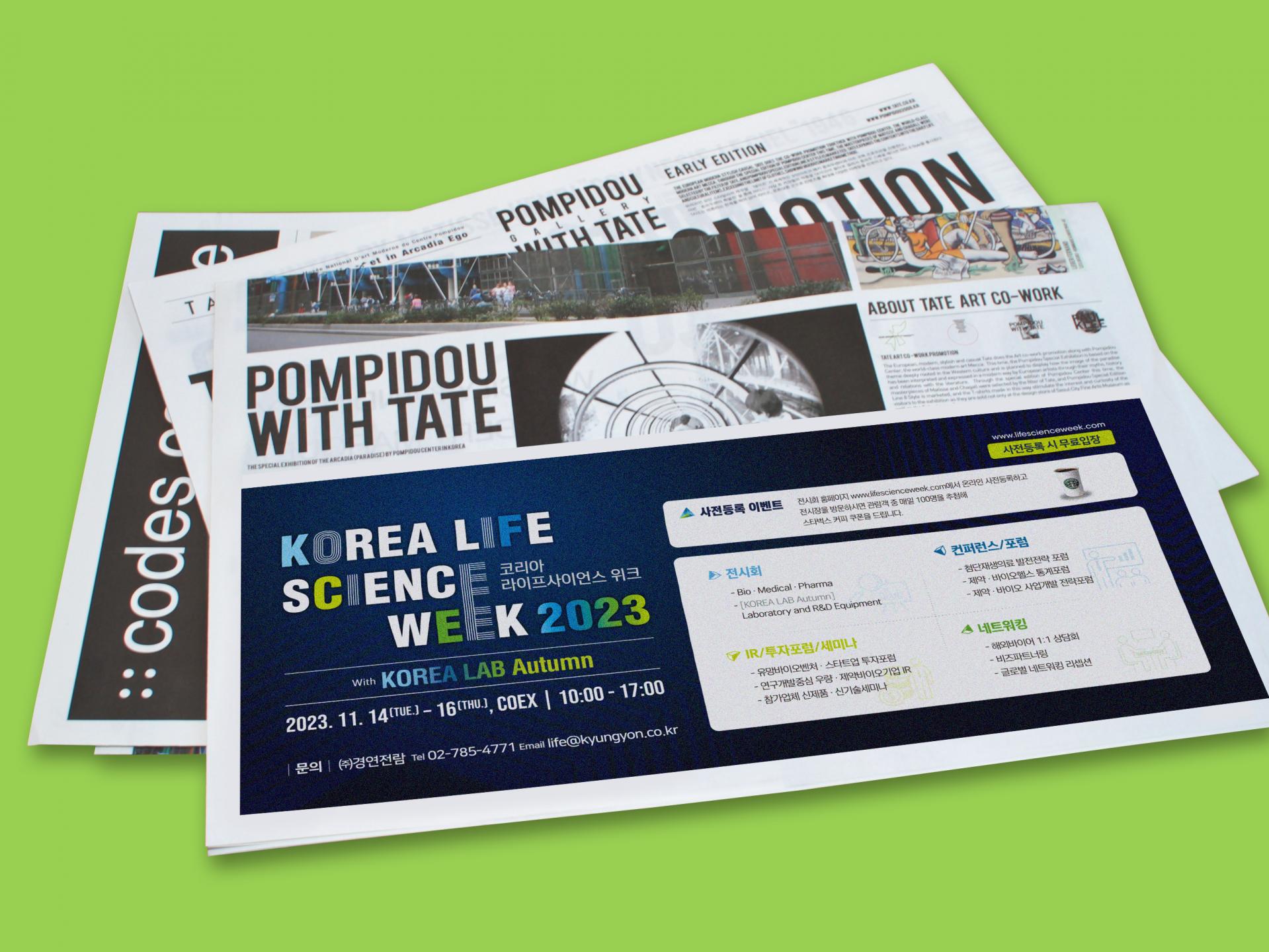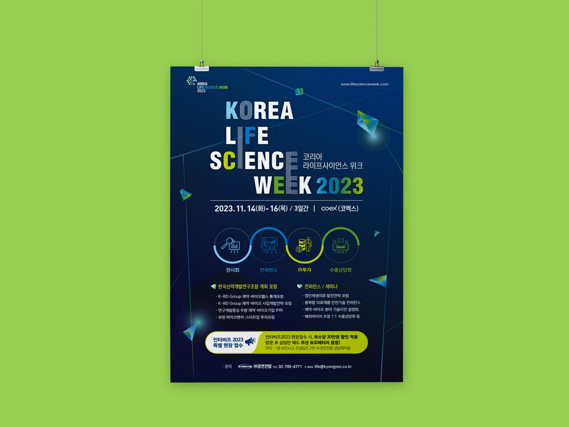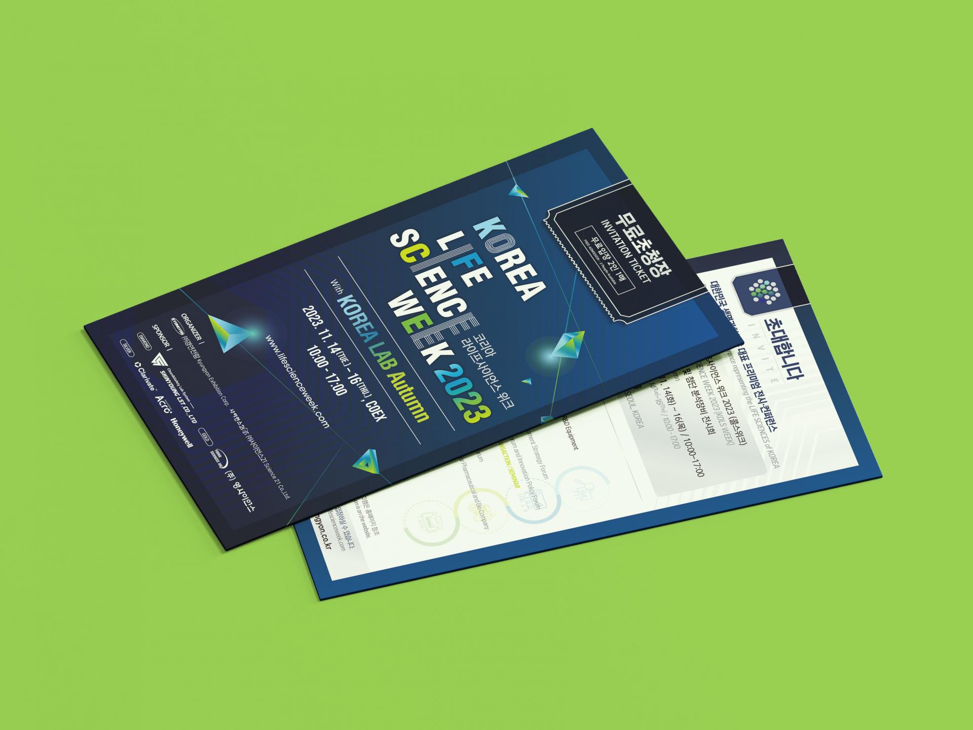 생명과학분야의 최신 동향 공유와 업계 간 파트너십 강화를 위한 대형 컨퍼런스 홍보물입니다. 타이포그래피 요소가 들어간 메인 타이틀과 비정형 기하학 도형 그래픽으로 화사하고 미래지향적인 느낌을 주되 가벼워 보이지 않도록 배경은 짙은 채도 낮은 네이비 컬러를 사용했습니다. 사이즈, 제작 형태에 따른 베리에이션을 고려한 키비주얼로 다양한 용도의 인쇄물에 응용되었습니다.