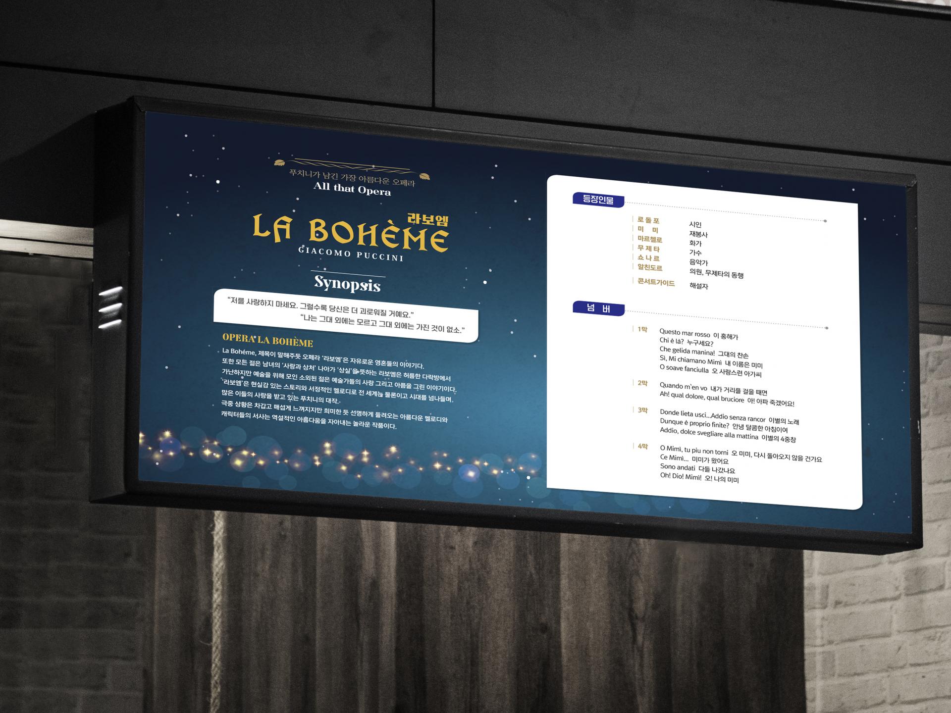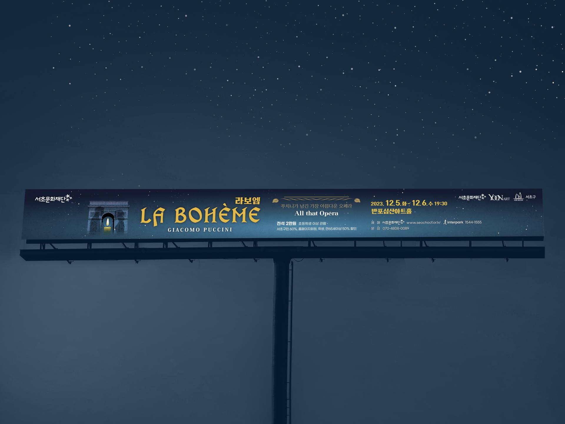 밤의 개선문과 주인공들의 실루엣, 1막 아리아의 주제인 촛불을 매치해 배경인 파리의 낭만적인 분위기를 잘 그려낸 디자인입니다. 독특한 서체의 제목 타이포는 배경과 대비를 이루며 따뜻하면서도 이국적인 느낌을 더합니다. 공연 전 웹용 SNS, 당일 공연장 실사, 배포 인쇄물까지 공연 기간 내내 모든 제작물에 활용되었습니다.