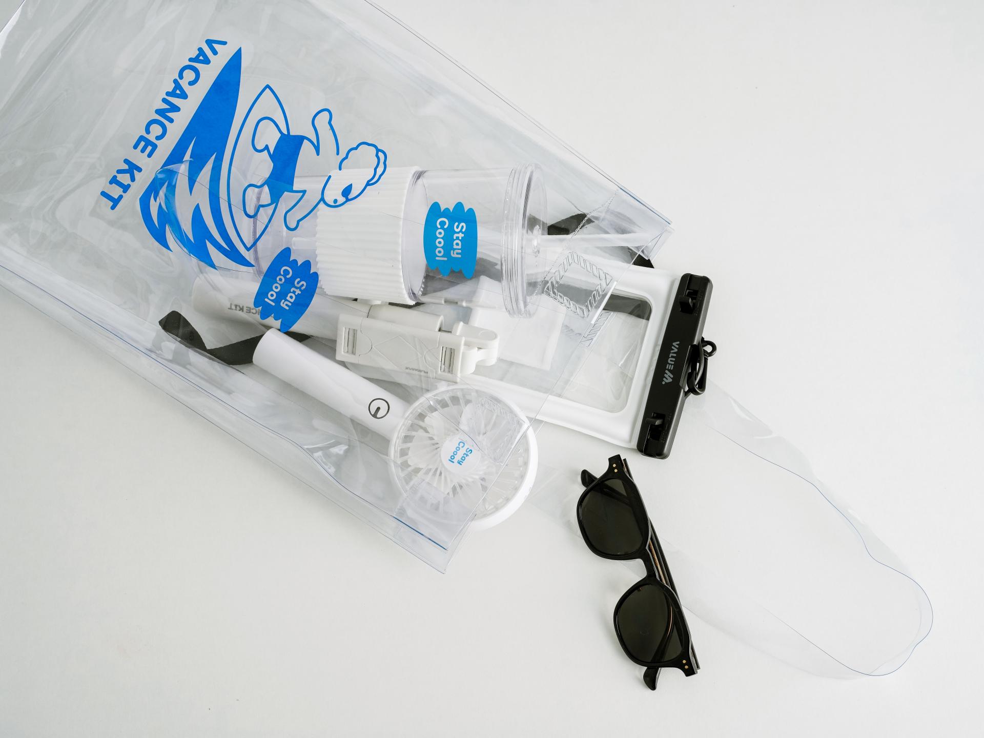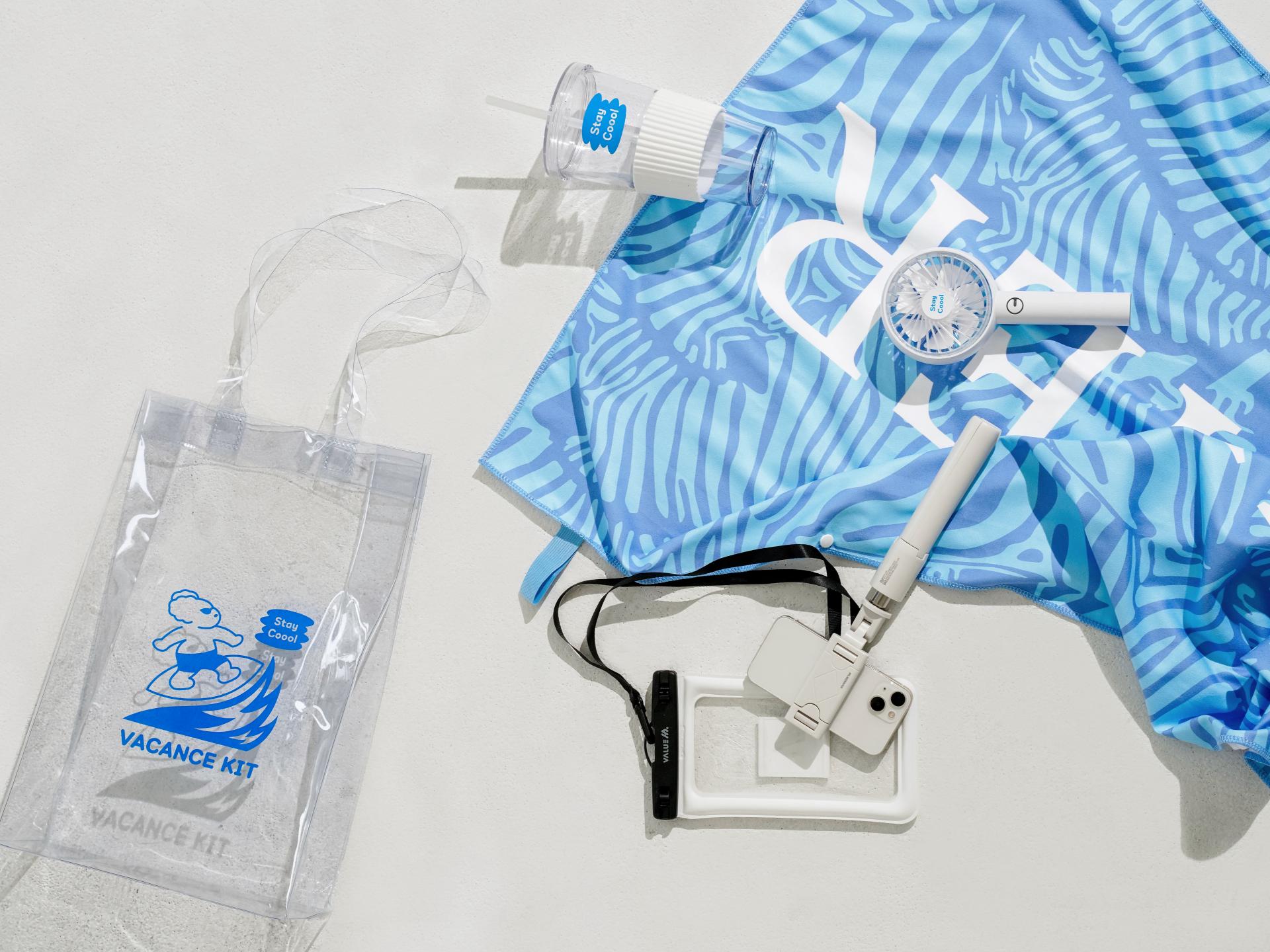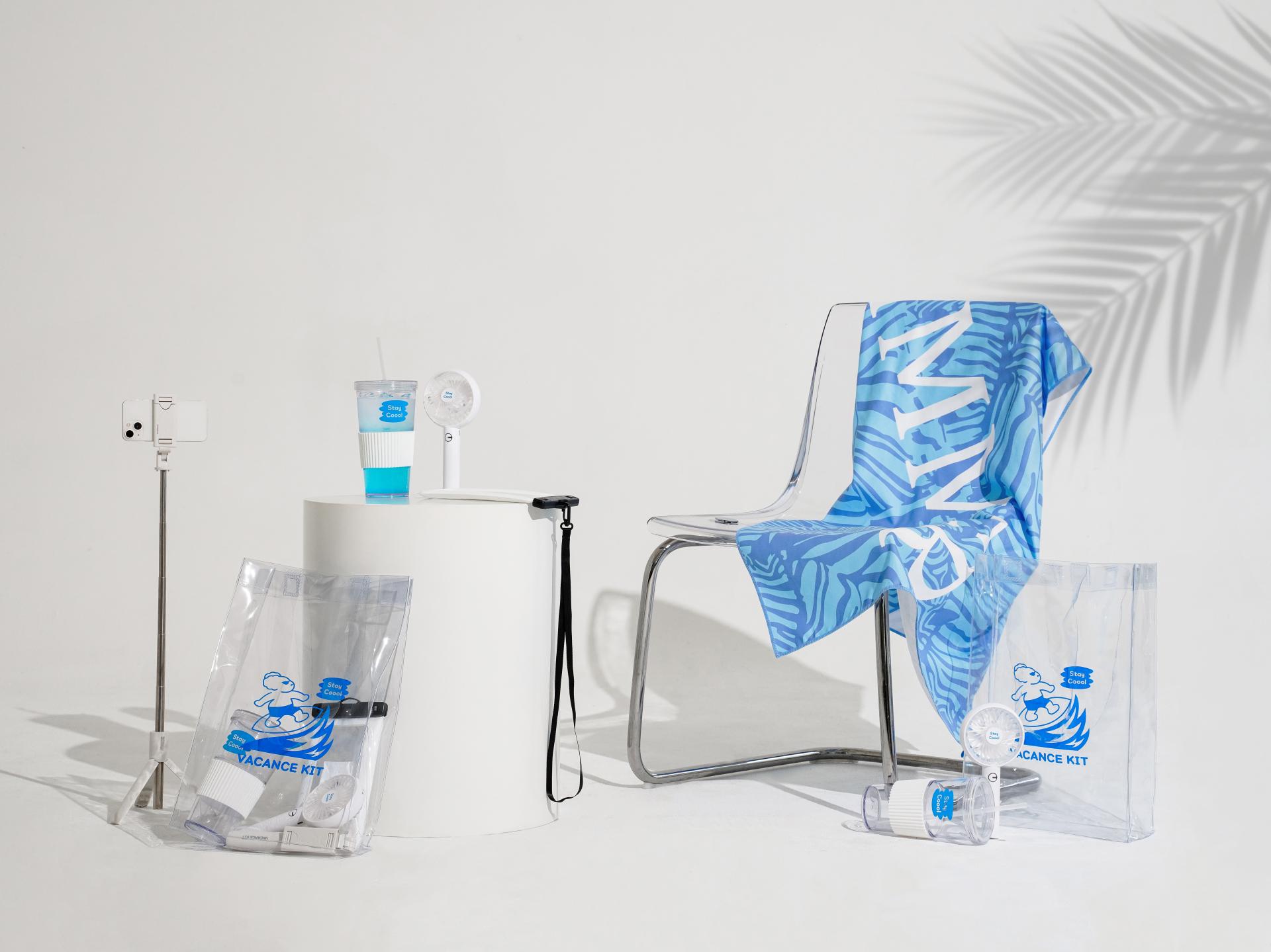 더운 여름 휴가철, 가볍게 떠나 시원하게 즐길 수 있도록 휴가지에서 자주 손이 가는 경량 아이템으로 선별해 구성한 여름 패키지입니다. 청량함이 느껴지는 투명+블루+화이트 톤과 위트있는 서핑 캐릭터 그래픽은 한눈에 여름 휴가 굿즈임을 알 수 있게 합니다.