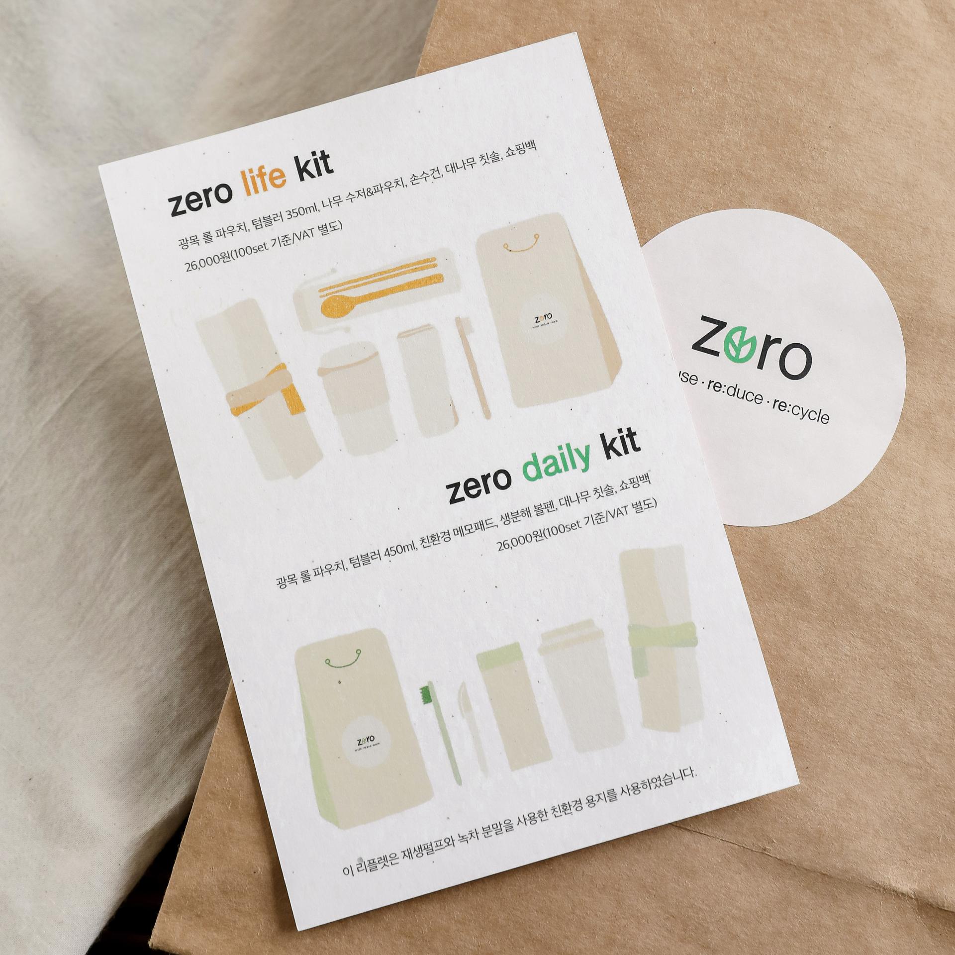 불필요한 포장재는 덜어내고 군더더기는 비워낸 제로키트라는 컨셉으로 일상에서 일회용품을 대체하고 쓰레기를 줄일 수 있는 방법을 고민해서 기획한 친환경 키트입니다. 광목천과 나무, 거즈 등 구성품의 색감과 소재의 조화를 고려하고 잎 모티브가 들어간 심볼 디자인으로 브랜딩하여 친환경적인 분위기를 더했습니다.