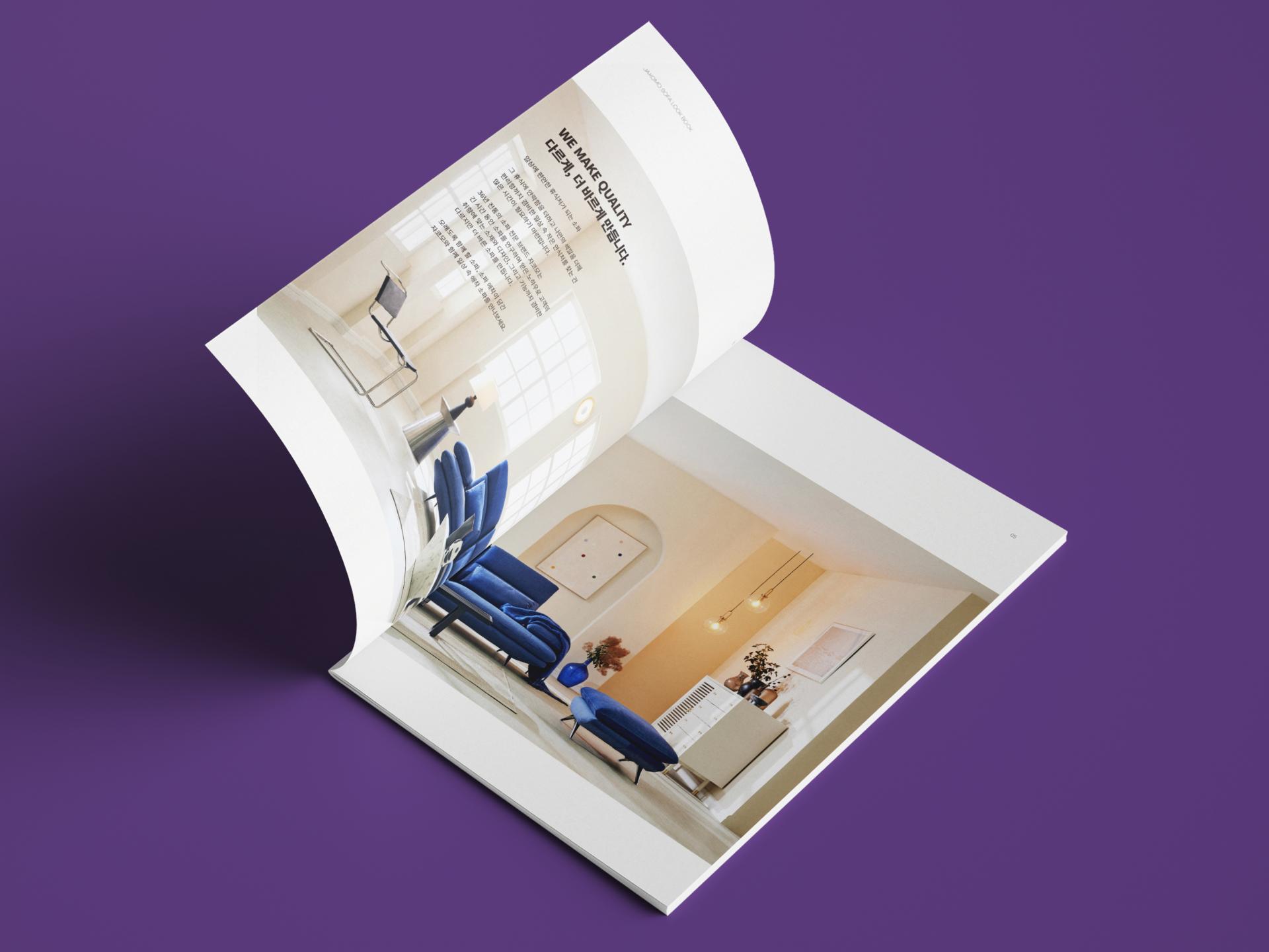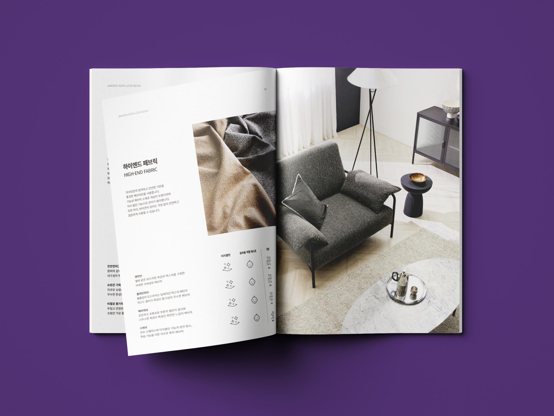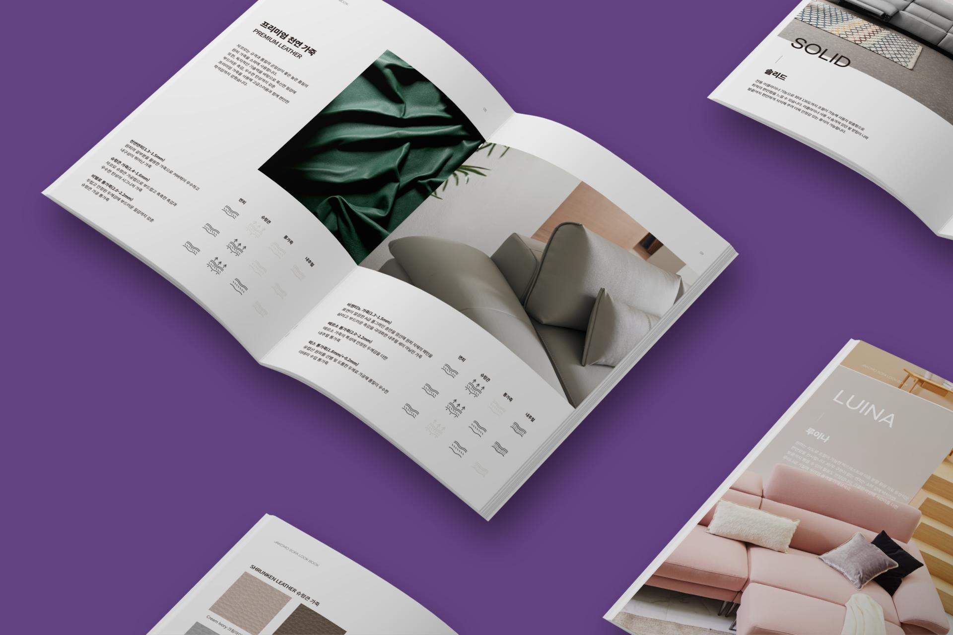 디자인 요소를 최소화하여 모델과 제품을 강조한 소파 카다로그입니다. 전체적으로 튀지않는 기본 세리프 서체를 사용하고 충분한 여백을 활용하였습니다. 소재 및 특징을 나타내는 아이콘을 개발하여 내용의 이해를 돕고자하였으며, 가죽과 패브릭의 색감이 원단 실물과 가깝게 표현될 수 있도록 세심한 색보정을 입혔습니다.