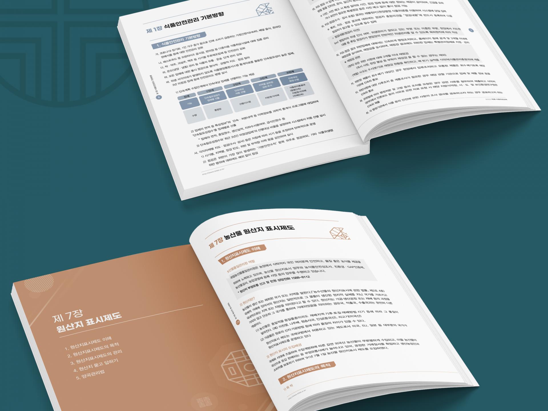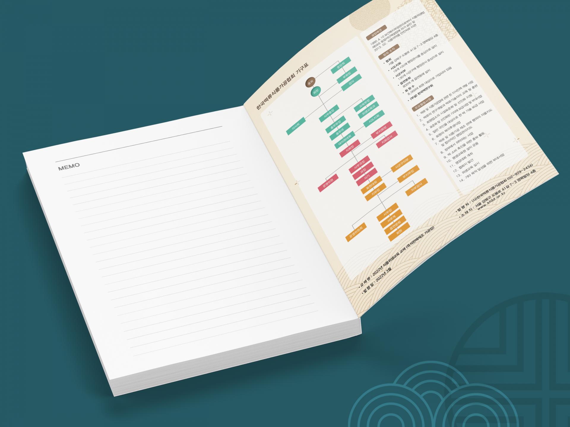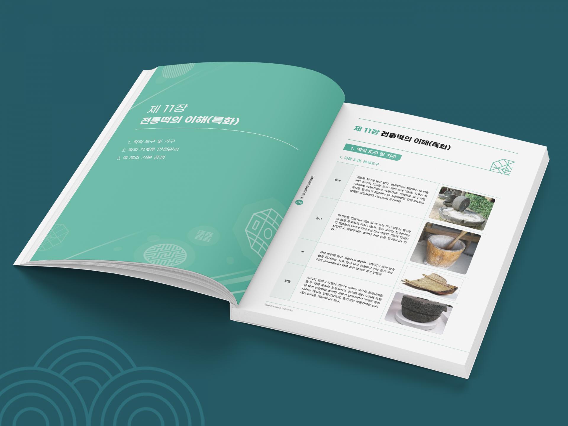 전통 패턴과 실사 이미지 배치로 내용을 직관적으로 표현한 떡류식품위생교육 책자입니다. 내지는 챕터별로 컬러를 구분, 라인과 전통 패턴을 포인트 요소로 깔끔하게 디자인했습니다.