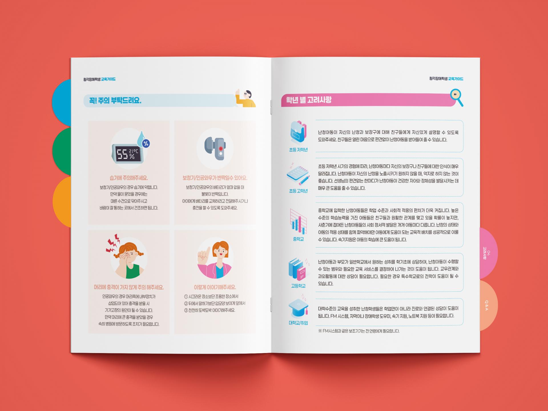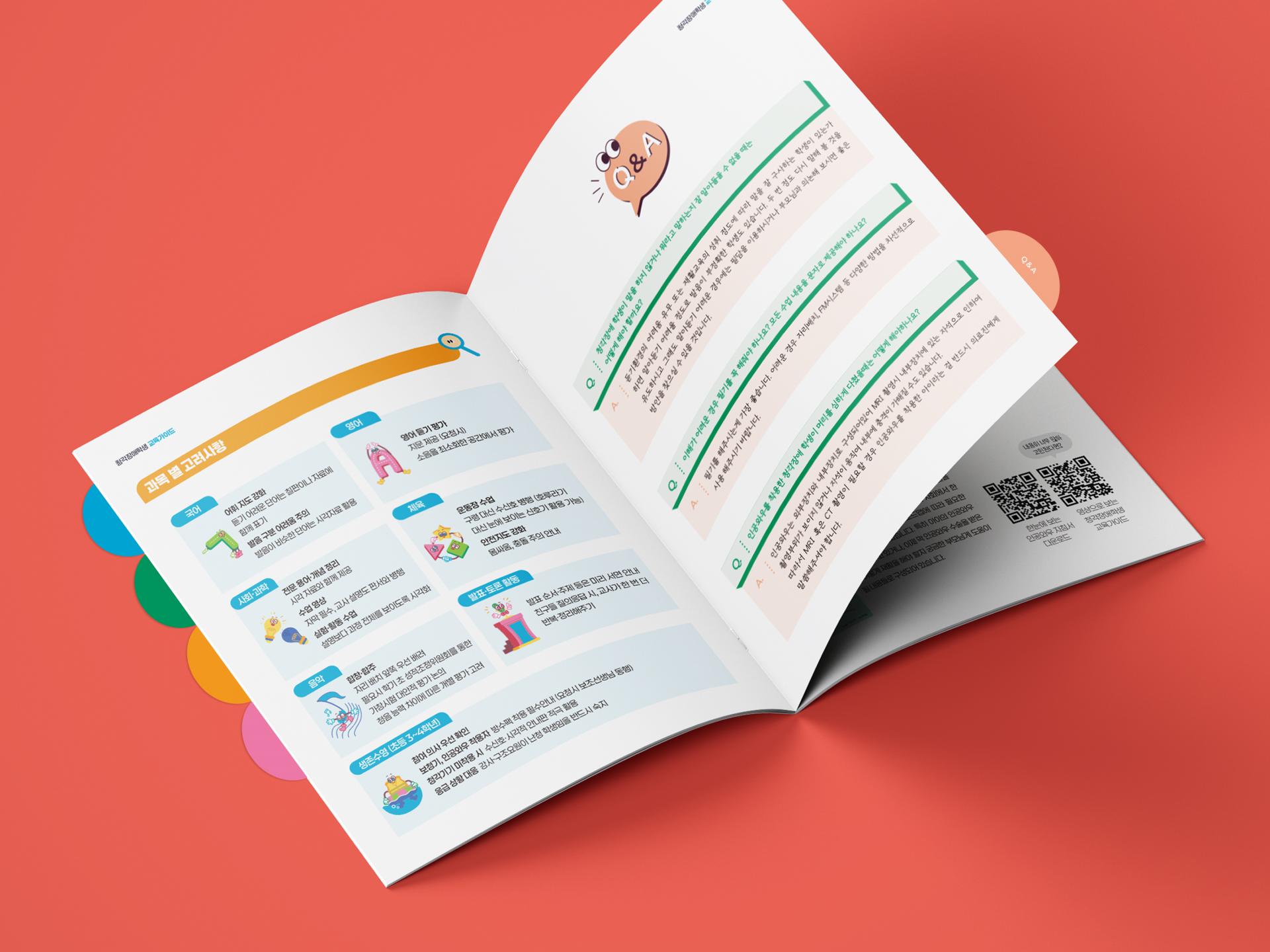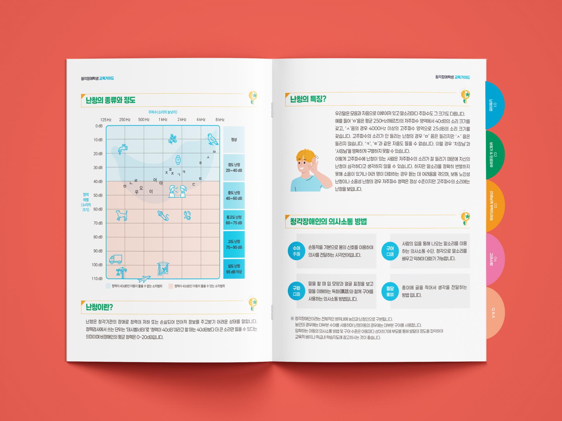 청각장애학생 지도에 필요한 정보를 효율적으로 전달하기위해 섹션별 탭 구조로 체계화한 교육 가이드북입니다. 직관적인 아이콘과 일러스트 인포그래픽을 활용하여 바쁜 교육 환경에서도 빠르게 참고할 수 있도록 가독성과 실용성에 집중한 디자인입니다.