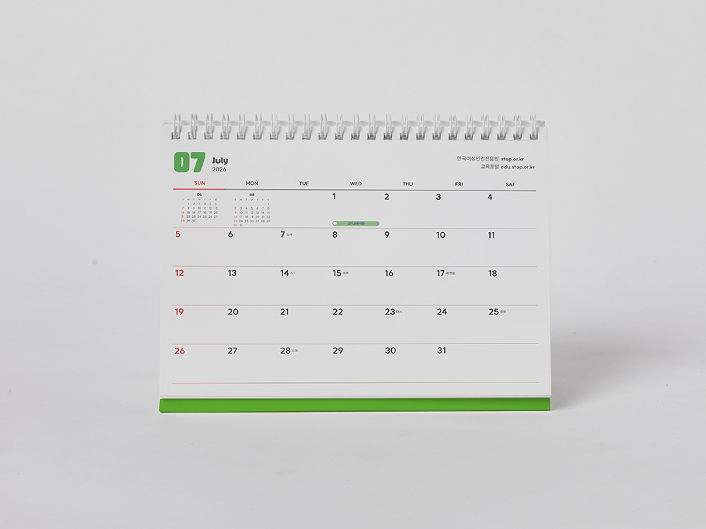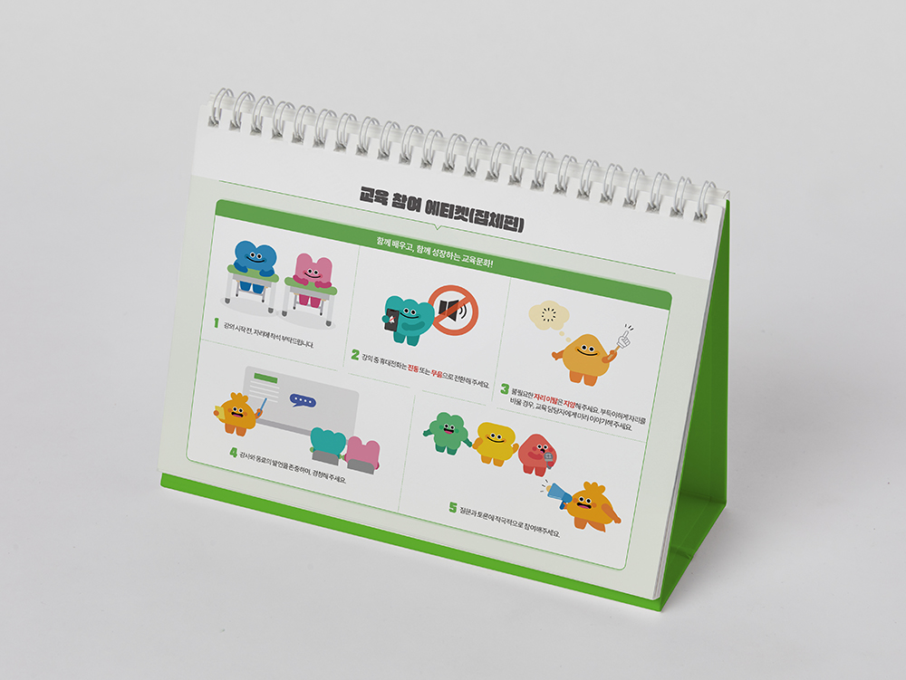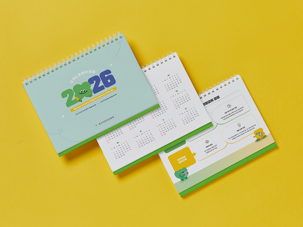 클라이언트 한국여성인권진흥원 디자인품목 탁상캘린더 제작연도 2025 | 밝은 연두색과 주황색으로 활기찬 에너지를 담았으며, 월별 교육 기간이 돋보이도록 정리했습니다. 귀여운 캐릭터로 친근함을 더하면서도, 공공기관이 주는 단정함과 신뢰감을 잃지 않도록 디자인했습니다.