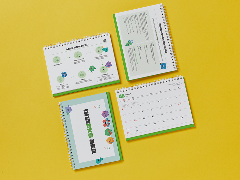 밝은 연두색과 주황색으로 활기찬 에너지를 담았으며, 월별 교육 기간이 돋보이도록 정리했습니다. 귀여운 캐릭터로 친근함을 더하면서도, 공공기관이 주는 단정함과 신뢰감을 잃지 않도록 디자인했습니다.