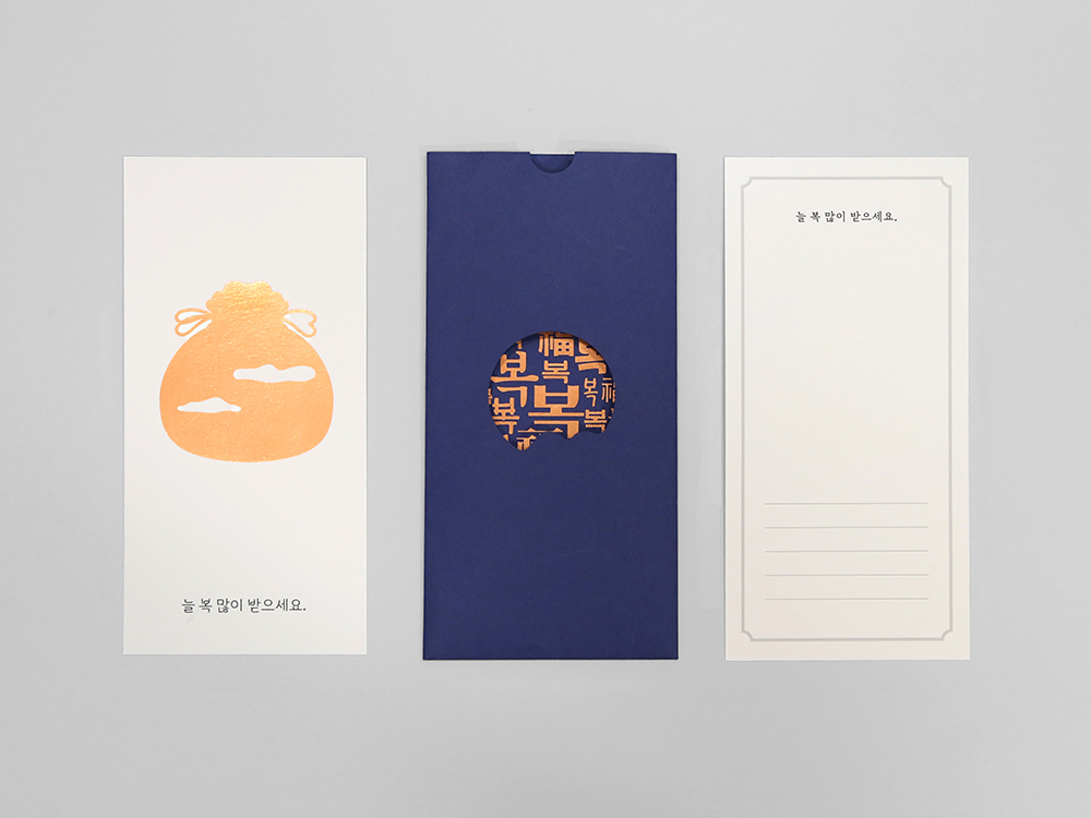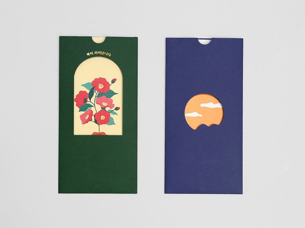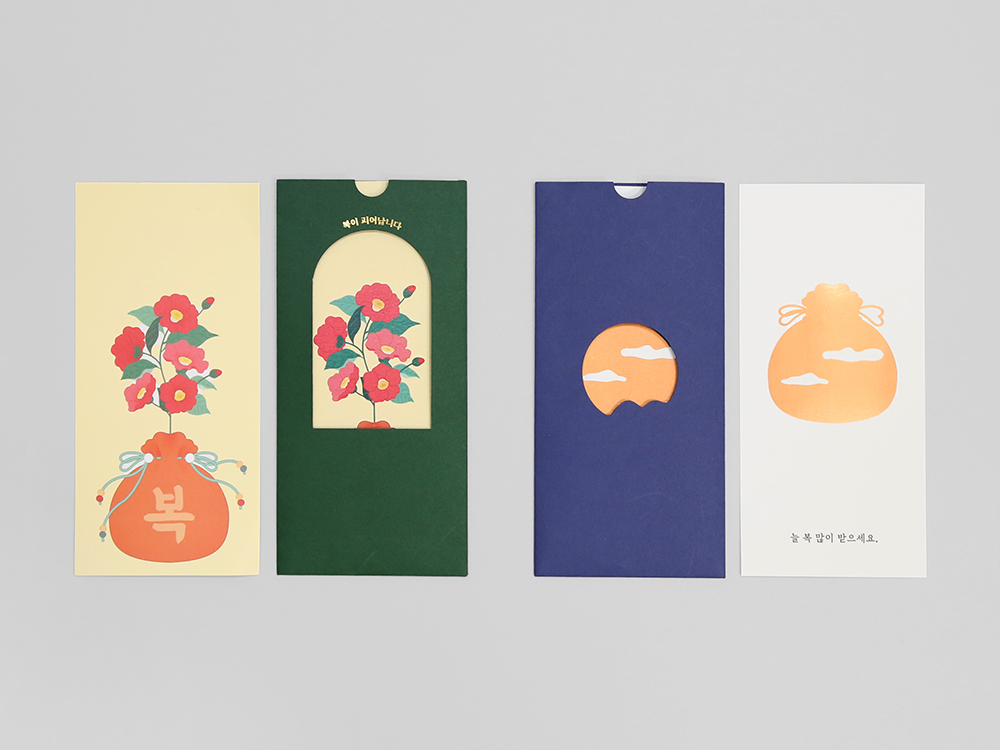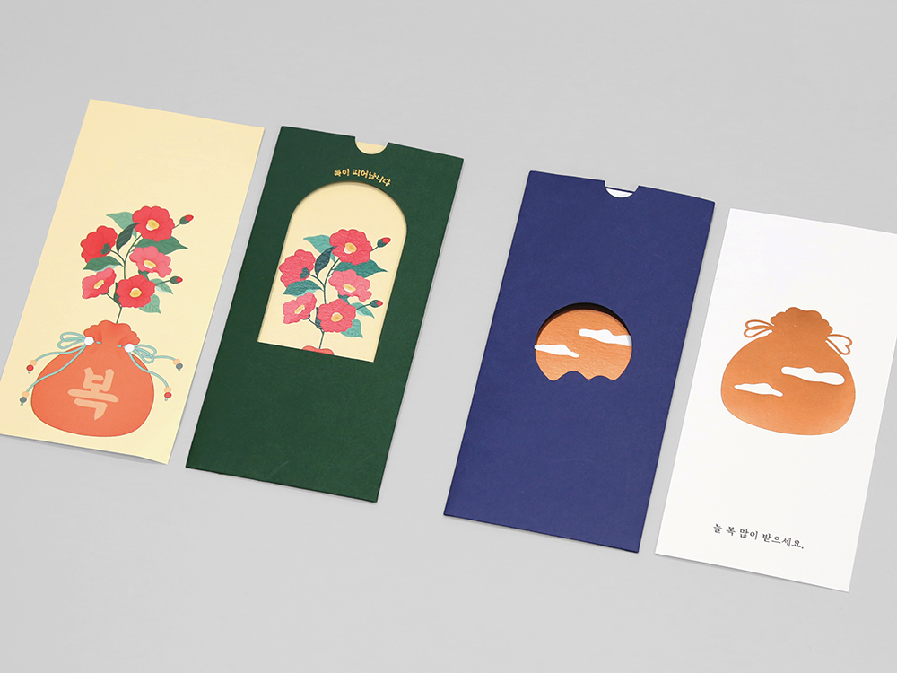 ‘복’을 주제로 삼되, 피어나는 꽃과 매일 떠오르는 해의 이미지를 활용해 명절뿐 아니라 다양한 경조사에도 폭넓게 사용할 수 있는 봉투입니다. 간단한 메시지를 적을 수 있는 마음카드의 그래픽과 전면 커팅이 입체적으로 어우러지며, 안쪽 면에도 후가공을 더해 마음카드를 꺼내는 순간 또 한 번의 즐거움을 제공합니다.