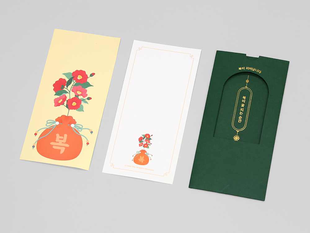 클라이언트 타라티피에스 | ‘복’을 주제로 삼되, 피어나는 꽃과 매일 떠오르는 해의 이미지를 활용해 명절뿐 아니라 다양한 경조사에도 폭넓게 사용할 수 있는 봉투입니다. 간단한 메시지를 적을 수 있는 마음카드의 그래픽과 전면 커팅이 입체적으로 어우러지며, 안쪽 면에도 후가공을 더해 마음카드를 꺼내는 순간 또 한 번의 즐거움을 제공합니다.